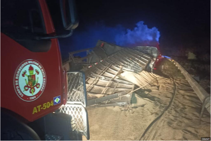 Carreta tomba na BR-070, espalha carga e causa incêndio; motorista fica ferido