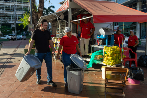 Prefeitura entrega 250 lixeiras a comerciantes e ambulantes do Centro de Cuiabá; Vídeo