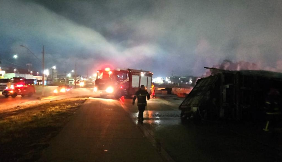 Carreta com carga de algodão pega fogo após tombar no Distrito Industrial de Cuiabá