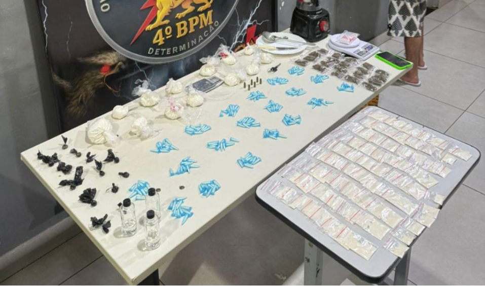 Em continuidade à ação, a equipe foi até a residência do suspeito, onde encontrou um ambiente utilizado para preparo e armazenamento de entorpecentes. No local, foram apreendidas mais de 200 porções de cocaína, pasta base e maconha, além de materiais usados na manipulação das substâncias. O homem foi preso em flagrante.