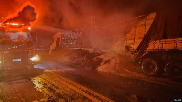 Na noite desta quarta-feira (17), o Corpo de Bombeiros Militar de Mato Grosso (CBMMT) atuou no combate a um incêndio em uma carga de soja transportada por uma carreta, na MT-130, km 174, em Primavera do Leste (265 km de Cuiabá). O chamado foi registrado às 23h43.