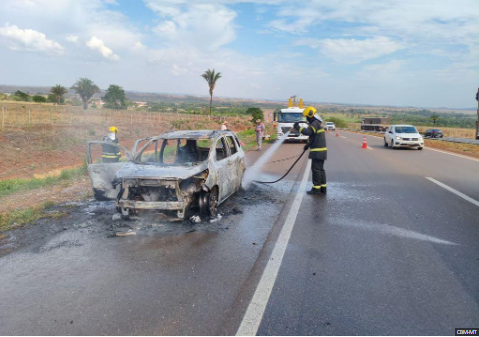 Nesta segunda-feira (17), o Corpo de Bombeiros Militar de Mato Grosso (CBMMT) atuou no combate a um incêndio que atingiu um carro de passeio no km 257 da BR-364, em Jaciara, a 146 km de Cuiabá. A equipe da 9ª Companhia Independente Bombeiro Militar (9ª CIBM) foi acionada pelo CIOSP e seguiu imediatamente para o local.