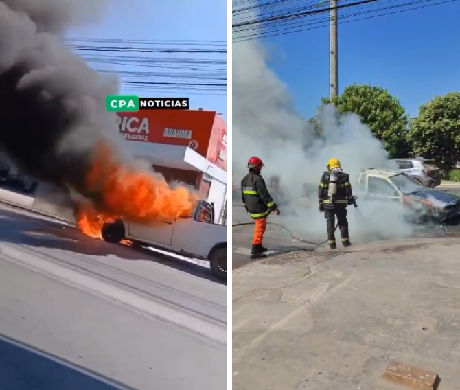 Na manhã desta sexta-feira (18) um carro pegou fogo na avenida Dante Martins de Oliveira, próximo à rotatória da avenida das Torres e ao bairro Pedregal, em Cuiabá.