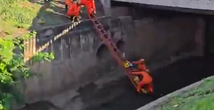 Idoso cai no Córrego do Barbado e é resgatado pelo Corpo de Bombeiros; Vídeo