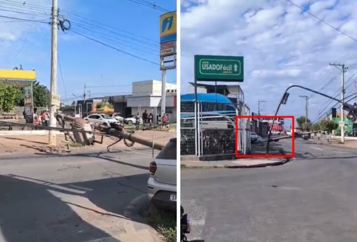 Carro derruba poste e deixa ocupantes presos no bairro Tijucal; Vídeo