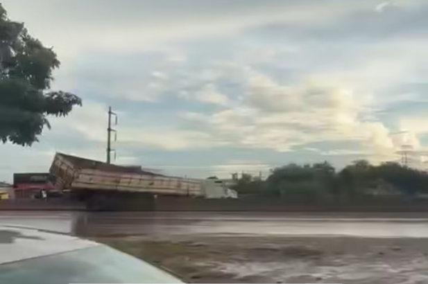 Caminhão perde controle e fica atravessado na BR-364 em Cuiabá; Vídeo