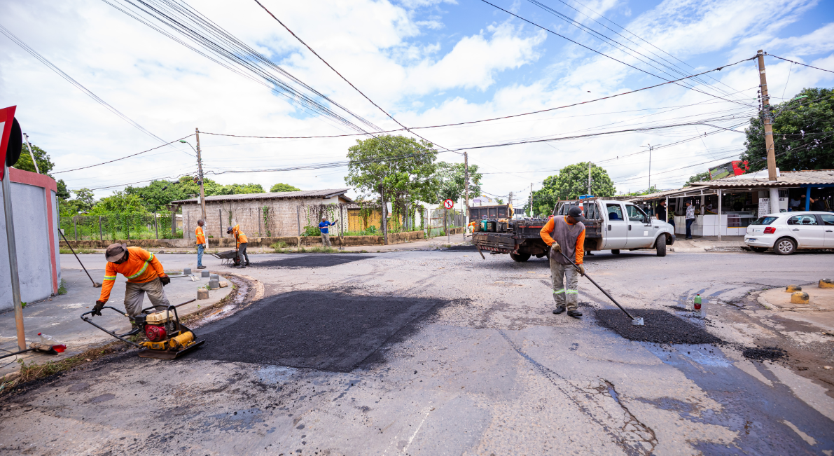Na região do bairro Praeirinho, uma equipe realizou reparos em quatro vias — Rua Paraíso, Rua Pascoal, Rua Paranatinga e Avenida Beira Rio — incluindo trechos próximos ao viaduto Murilo Domingos, antes de seguir com a programação do dia.