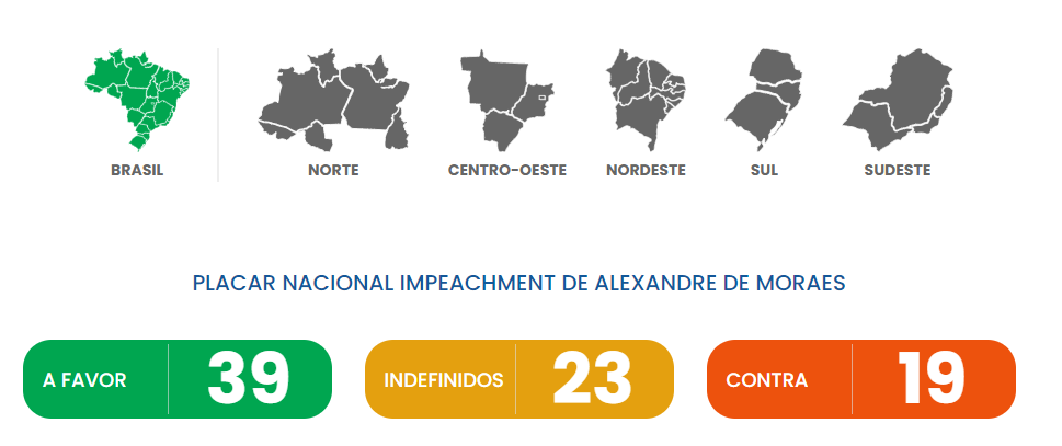 O número de senadores favoráveis ao impeachment do ministro Alexandre de Moraes, do Supremo Tribunal Federal (STF), chegou a 39 nesta quarta-feira (6), segundo levantamento do site Votos Senadores. A marca representa quase metade do Senado Federal, que possui 81 cadeiras. Ainda de acordo com a plataforma, 23 senadores seguem indecisos e 19 se posicionaram contra o processo.