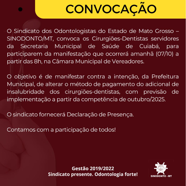 Nesta terça-feira (7), cirurgiões-dentistas da rede municipal de Cuiabá realizam uma manifestação na Câmara de Vereadores, a partir das 8h, em protesto contra a decisão da Prefeitura de alterar o cálculo do adicional de insalubridade pago aos profissionais da Saúde.