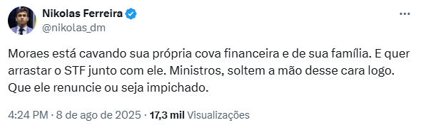 “Moraes está cavando sua própria cova financeira e de sua família. E quer arrastar o STF junto com ele. Ministros, soltem a mão desse cara logo. Que ele renuncie ou seja impichado.”