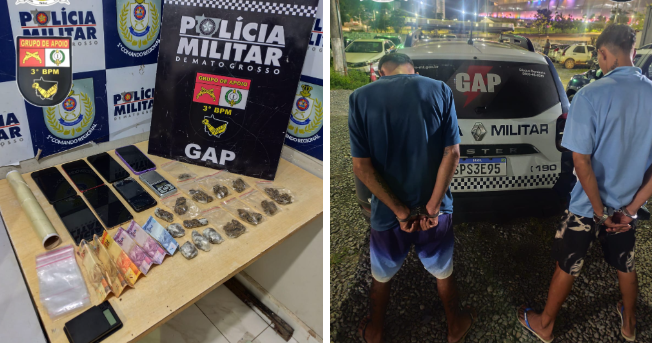 Naa quinta-feira (12), por volta das 23h40, dois homens foram detidos durante uma ação do Grupo de Apoio (GAP 01), do 3º BPM, no bairro Altos da Serra, em Cuiabá, após denúncia relacionada ao comércio de entorpecentes.