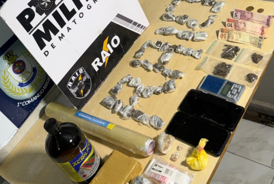 Durante a abordagem, os militares recolheram 57 porções de entorpecentes, entre maconha e pasta base de cocaína, além de materiais utilizados para preparo e embalagem das substâncias ilícitas.