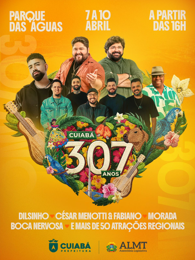 Nesta terça-feira (7), a programação oficial do aniversário de Cuiabá tem início com uma grande festa gratuita no Parque das Águas, reunindo shows nacionais e diversas atrações culturais até sexta-feira (10).