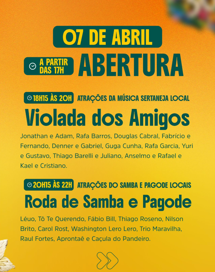 Antes disso, às 18h15, a programação valoriza artistas locais com a “Violada dos Amigos”, reunindo nomes como Jonathan e Adam, Rafa Barros, Douglas Cabral, Fabrício e Fernando, Denner e Gabriel, entre outros destaques do sertanejo regional.