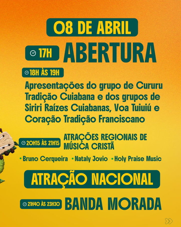 Na quarta-feira (8), data em que Cuiabá celebra seus 307 anos, a programação destaca a cultura tradicional, com apresentações de cururu e siriri. À noite, o público acompanha shows de música gospel, encerrando com a apresentação nacional da banda Morada.