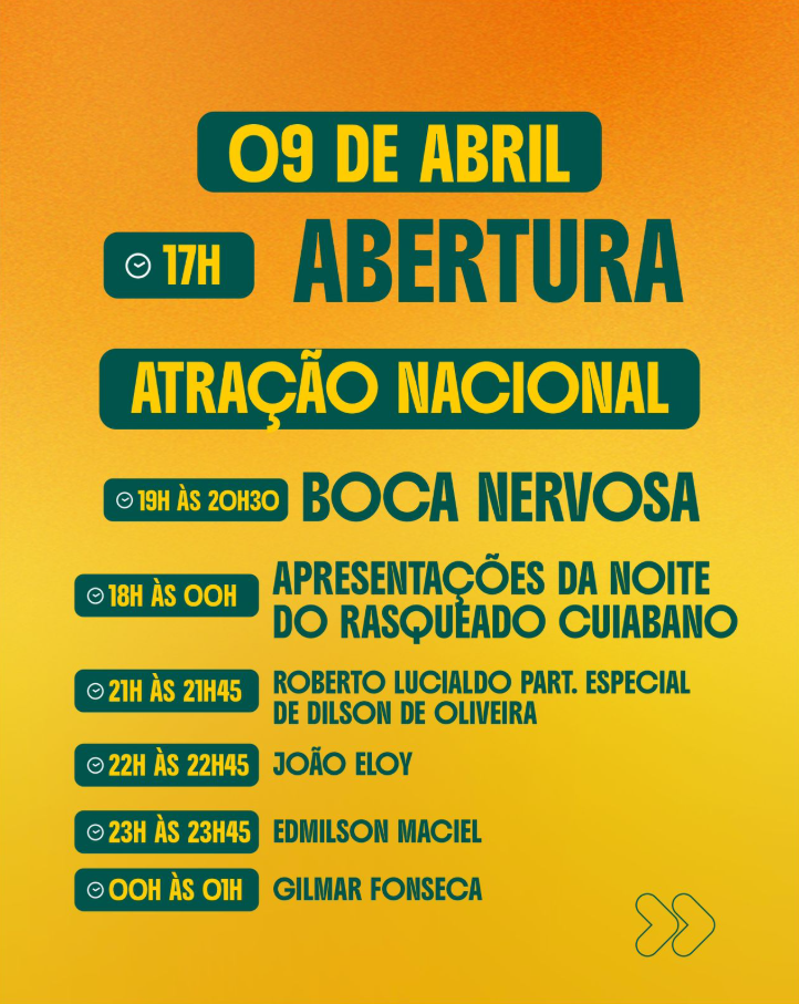Na quinta-feira (9), o destaque é o show do Boca Nervosa, além de uma noite dedicada ao rasqueado cuiabano, com artistas que representam a identidade cultural da capital.