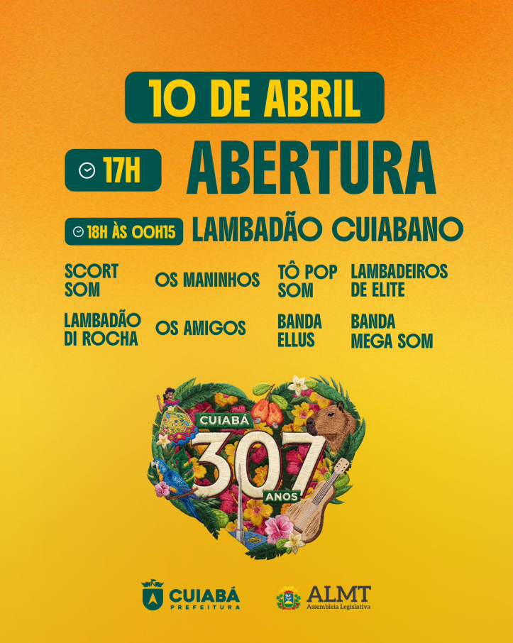 A festa é gratuita e promete reunir milhares de pessoas em um dos maiores eventos já realizados na capital, celebrando a história, a cultura e a diversidade de Cuiabá.