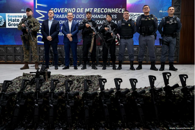 O Governo de Mato Grosso entregou, na manhã desta terça-feira (22), equipamentos de ponta à Polícia Militar, incluindo 128 fuzis Arad, cinco metralhadoras Negev, armas Taser e tecnologia de visão noturna, totalizando um investimento de R$ 6 milhões. A entrega ocorreu no auditório Cloves Vetoratto, em Cuiabá, e visa reforçar a segurança em todos os 142 municípios do estado.