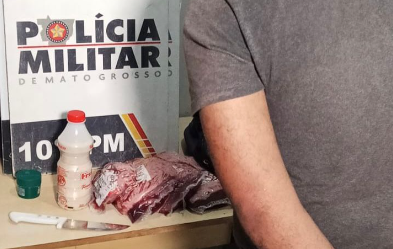 As equipes da PM iniciaram rondas imediatas na região e conseguiram localizar o suspeito pouco tempo depois. Durante a abordagem e a busca pessoal, os militares encontraram quatro peças de picanha, uma garrafa de leite fermentado e a faca usada na ameaça, todos dentro de uma mochila.
