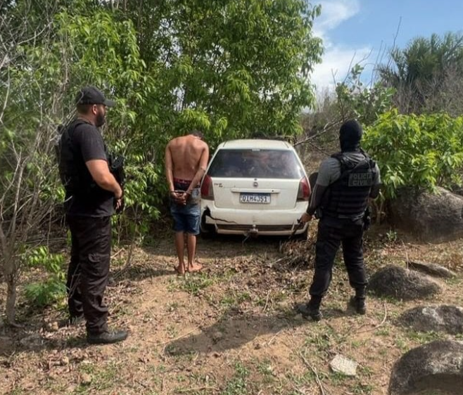 No local, os policiais encontraram dois homens, que fugiram mata adentro ao verem a equipe. Um deles, de 27 anos, foi preso após tropeçar e cair, portando uma espingarda. O outro suspeito conseguiu se esconder. Também foi apreendido um celular quebrado, usado pelo suspeito para fazer lives com membros da facção criminosa.