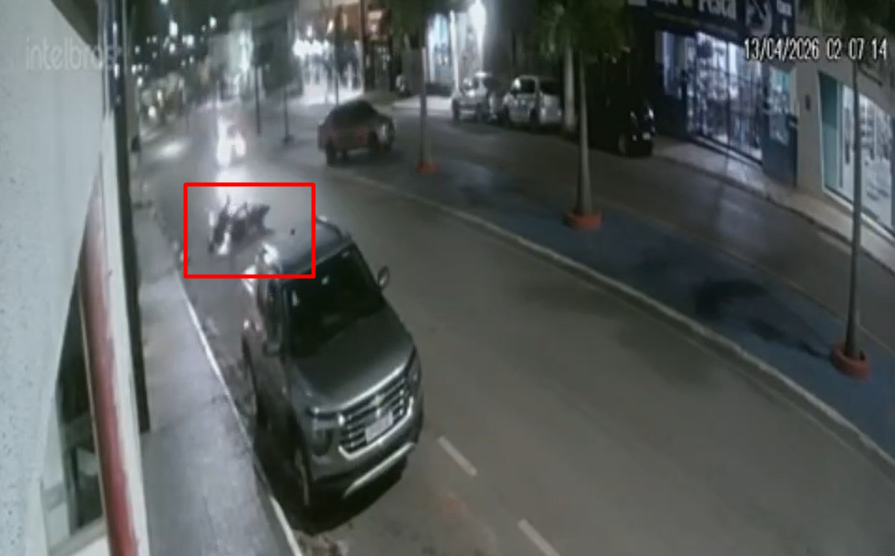 A colisão ocorreu por volta das 02h, na Avenida Prefeito Caio, e foi registrada por câmeras de segurança. As imagens mostram o momento em que o motociclista perde o controle da direção e atinge com violência uma camionete que estava estacionada em frente a um estabelecimento comercial.