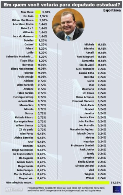 Nesta quinta-feira (5.9), pesquisa espontânea realizada pelo Índice Pesquisas aponta o presidente da Assembleia Legislativa, Max Russi (PSB), como líder disparado na corrida para deputado estadual em Mato Grosso. Russi, que deve assumir o comando do Podemos em 2026, aparece à frente na preferência do eleitorado.