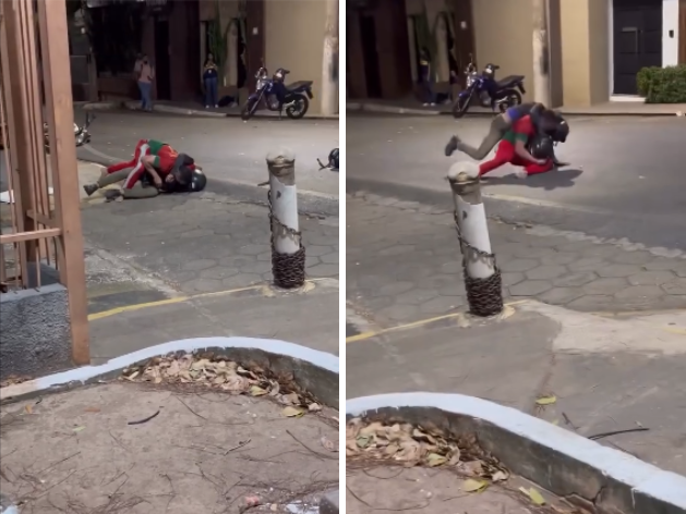 Na noite desta segunda-feira (22), um motoboy e um passageiro se desentenderam próximo ao Colégio Liceu Cuiabano, em Cuiabá, e acabaram partindo para a briga física.