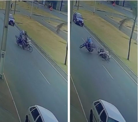 Nas imagens, é possível ver o motociclista, conduzindo uma Yamaha Lander, fazendo manobras arriscadas. Ao ultrapassar uma moto e um carro, ele perde o controle, invade a faixa à esquerda e colide com a motocicleta da mulher. Apesar de se levantar e verificar a moto, o Boletim de Ocorrência afirma que ele fugiu do local sem prestar socorro.