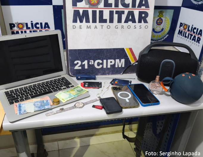 Dentro do veículo, os policiais encontraram diversos objetos, entre eles um notebook MacBook, caixas de som, celulares, relógio, pulseira, pendrive, perfume, carregador portátil, cartões bancários em nome de terceiros, além de uma cédula estrangeira e uma chave de fenda. Todo o material foi tratado como possível produto de furto.