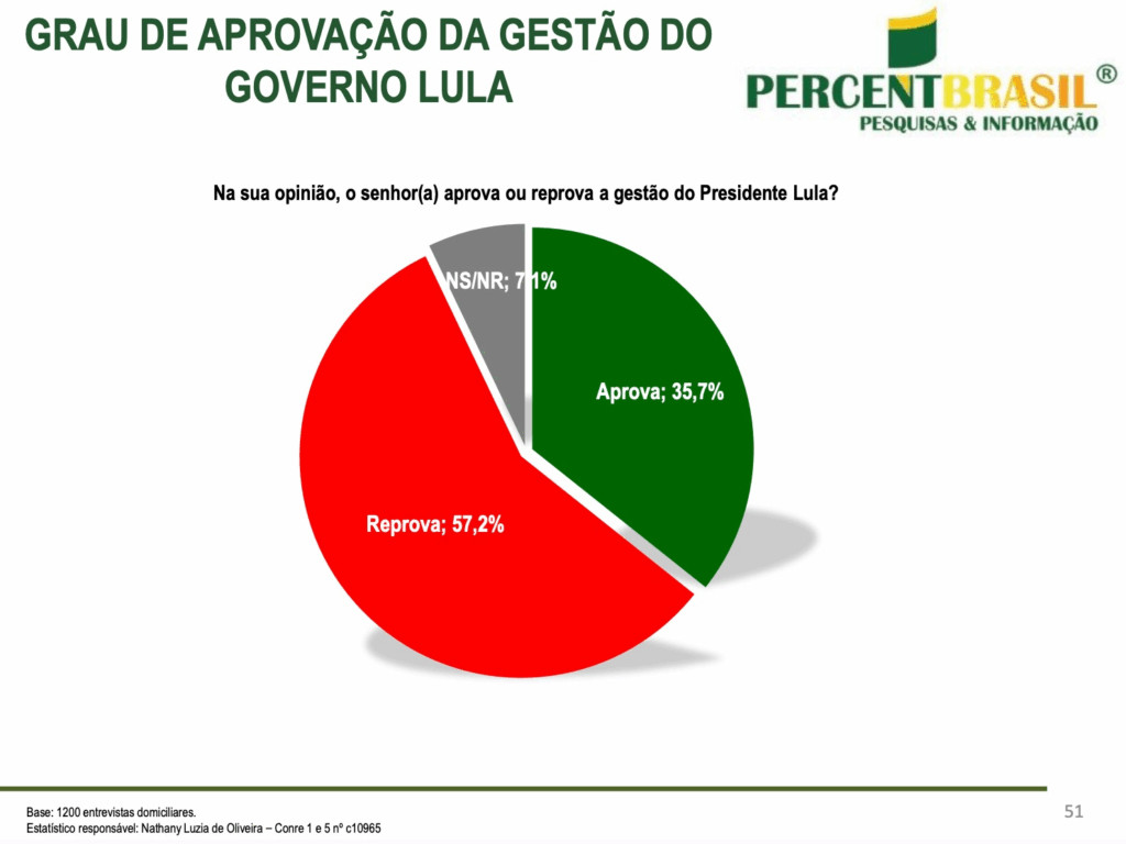 A gestão do presidente Luiz Inácio Lula da Silva (PT) é desaprovada por 57,2% da população de Mato Grosso, segundo levantamento do Instituto Percent Brasil, divulgado na segunda-feira (11). Já 35,7% afirmaram aprovar o governo petista e 7,1% não souberam ou não opinaram.