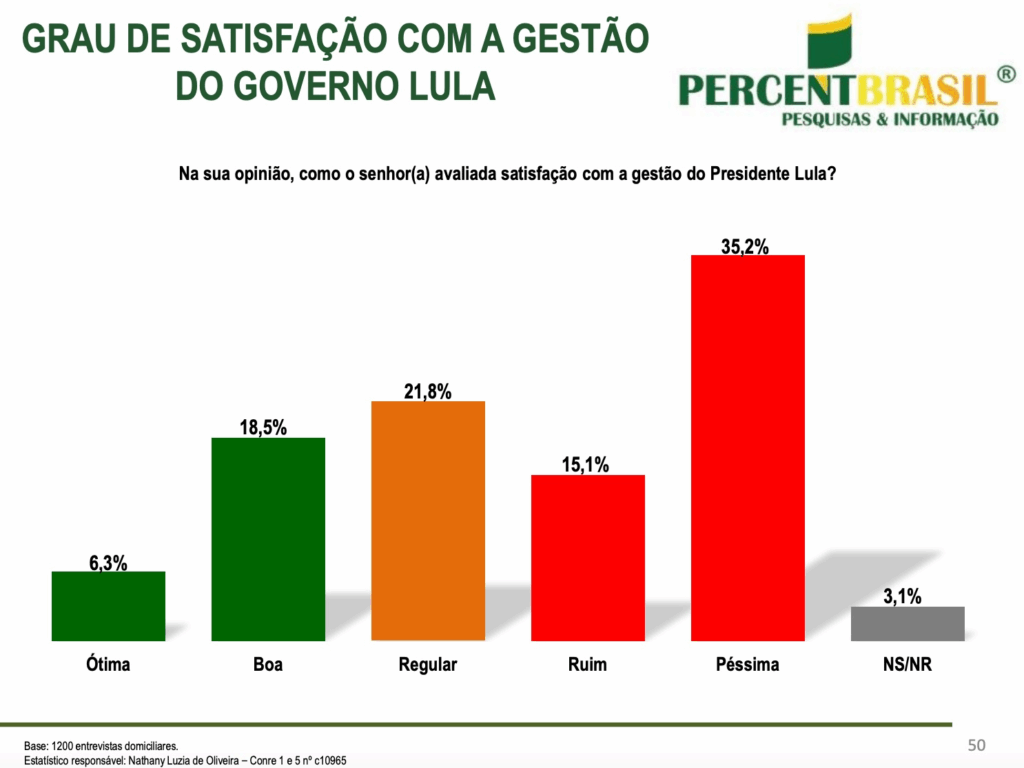 O estudo também mediu o grau de satisfação com a administração federal: 6,3% consideram a gestão ótima e 18,5% boa, totalizando 24,8% de avaliação positiva. Por outro lado, 15,1% classificaram como ruim e 35,2% como péssima, somando 50,3% de avaliação negativa. Outros 21,8% disseram ser regular e 3,1% não responderam.