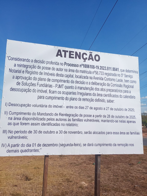 Segundo as informações divulgadas nas placas, os ocupantes têm prazo para desocupar voluntariamente entre 27 de agosto e 27 de outubro. A partir do dia 28 de outubro, será cumprido o mandado de reintegração de posse, sendo permitido que apenas famílias em situação de vulnerabilidade permaneçam até 30 de novembro. A partir de 1º de dezembro, terá início a remoção dos demais quadrantes ocupados.