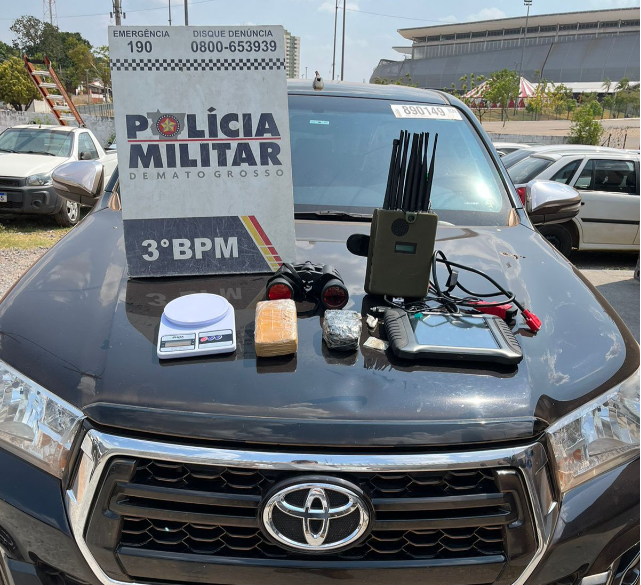 Na busca veicular, a equipe do 3º BPM localizou um aparelho bloqueador de sinal de carros e um aparelho utilizado para dar partida em caminhonetes. Também com a dupla, um tablete e meio e porções de maconha foram apreendidas.