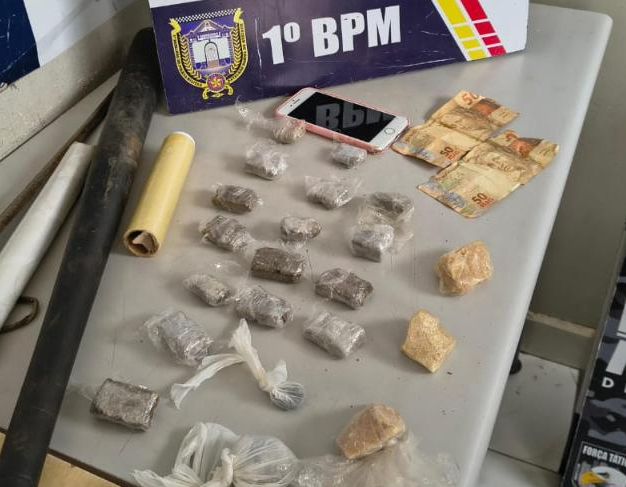 Durante a varredura, os militares encontraram uma bolsa com 18 porções de maconha, três porções de pasta-base e materiais usados para embalagem de drogas. O suspeito preso foi levado para a Central de Flagrantes, onde foi confirmado que ele possui diversas passagens por tráfico de drogas.