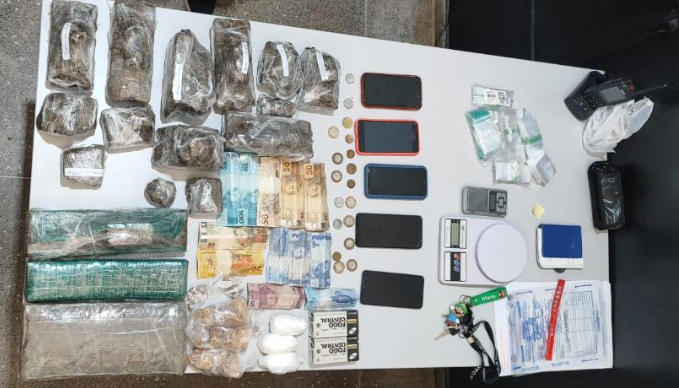 - Diversas porções e três tabletes de maconha embalados e etiquetados;