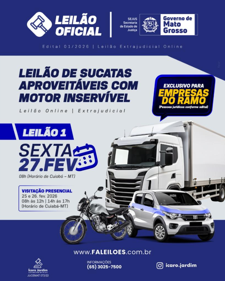 O certame será realizado de forma exclusivamente online, pelo site www.faleiloes.com.br, e é voltado apenas para empresas do ramo (pessoas jurídicas), conforme previsto no edital. Além desta sexta-feira, também haverá sessões nos dias 10 e 18 de março. A primeira etapa começa às 8h (horário de Cuiabá).