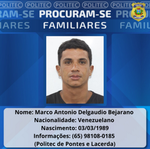 Também são procurados familiares de Marco Antonio Delgaudio Bejarano, de nacionalidade venezuelana, nascido em 03/03/1989, vítima de acidente de trânsito que resultou em óbito em 30/04/2025. Marco Antonio é filho de Tibisay Coromoto Bejarano Arresza e Joel Alexander Delgaudio Petit.