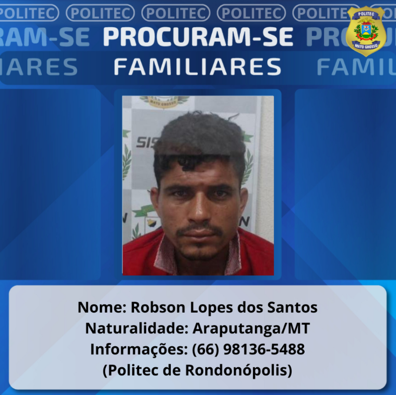 Também é buscado contato com parentes de Robson Lopes dos Santos, natural de Araputanga (MT), nascido em 5 de agosto de 1989, filho de Cida Aparecida de Souza e João Lopes dos Santos. Ele foi vítima de homicídio no dia 2 de janeiro de 2026, no bairro Pedra 90. Conforme a Politec, há informação de que ele possui familiares na região Norte de Mato Grosso.