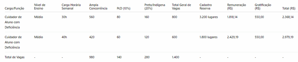 O processo é destinado ao cargo de Cuidador de Aluno com Deficiência (CAD), com exigência de nível médio de escolaridade.