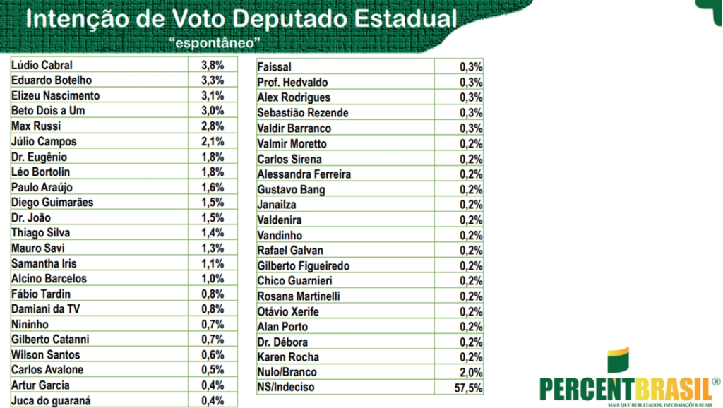 Nesta segunda-feira (23), levantamento do instituto Percent Brasil revelou os principais nomes lembrados espontaneamente pelos eleitores para deputado estadual em Mato Grosso, destacando um cenário ainda pulverizado, mas com movimentações relevantes dentro dos partidos.