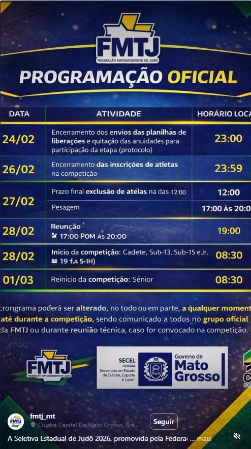 A programação oficial começa na sexta-feira (27), às 17h, com a chegada das delegações e procedimentos iniciais. No sábado (28), as disputas terão início às 8h30, envolvendo as categorias Cadete, Sub-13 e Sub-15. Já no domingo (1º de março), os combates recomeçam às 8h30 com a categoria Sênior, e encerramento previsto para as 14h.