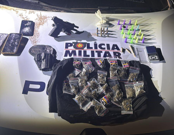 Ao chegar no local, os policiais flagraram o homem tentando fugir da abordagem e a mulher destruindo celulares. Durante as buscas, a PM encontrou a arma escondida dentro da casa, além de dez porções de maconha. O suspeito confessou participação indireta no crime, alegando que guardava a arma utilizada no homicídio e revelou ainda que fazia parte de uma facção criminosa.