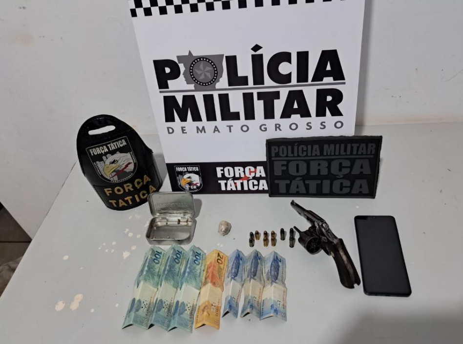 Durante a ação, foram apreendidos um revólver calibre .32, 10 munições, uma porção de substância análoga à maconha, dois celulares e R$ 326 em dinheiro.