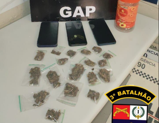 Na busca pessoal, os policiais encontraram duas porções de substância análoga à maconha. Questionado, o homem informou que havia mais entorpecentes escondidos em um terreno baldio. Em varredura no local, os militares localizaram outras 16 porções da mesma substância, armazenadas em um pote plástico.