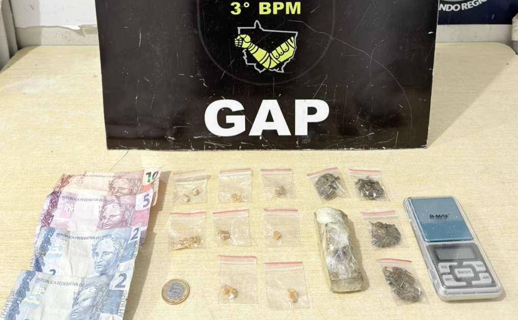 Diante da situação, foi solicitado apoio do Grupo de Apoio (GAP), e, em ação conjunta, os policiais abordaram um homem que deixava o local portando diversos invólucros com substância análoga à maconha.