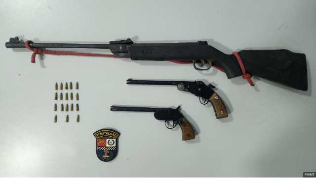 Na busca pelo imóvel, os policiais encontraram um quarto trancado, onde estavam os dois adolescentes e o funcionário, que estava amarrado. No local, também foram apreendidas duas espingardas garrucha e munições.